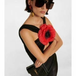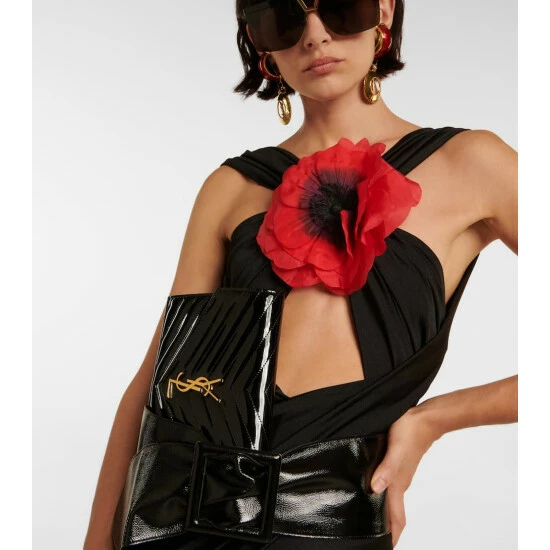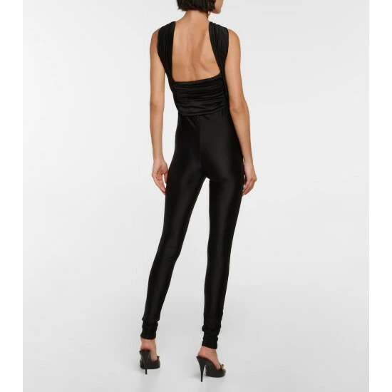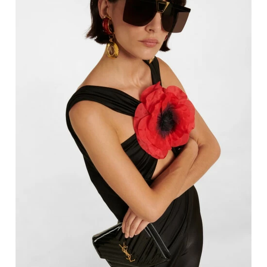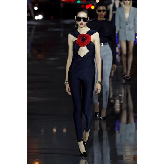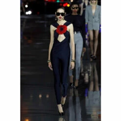 Saint Laurent’s jumpsuit is made from stretchy, shiny jersey fabric with gathered paneling that crosses at the bodice. Cut for a slim fit, it’s defined by a large silk flower appliqué at the chest.
