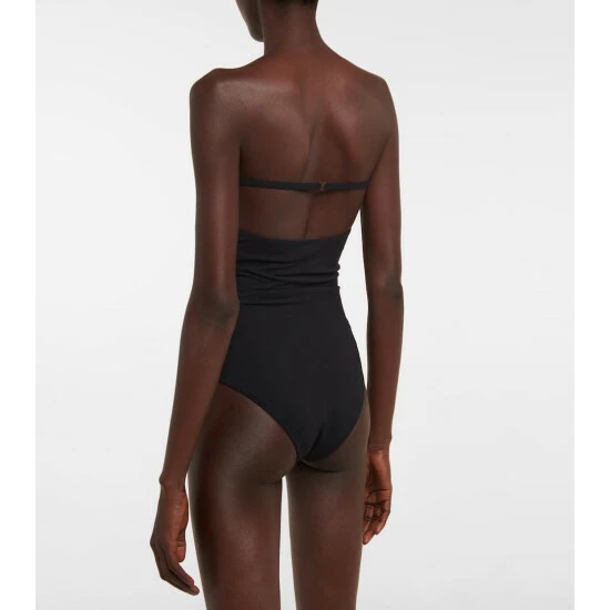 This Saint Laurent style is the LBD of swimsuits. Streamlined and chic β very much in line with the maison’s aesthetic β this one-piece has a bandeau neckline and medium coverage briefs.