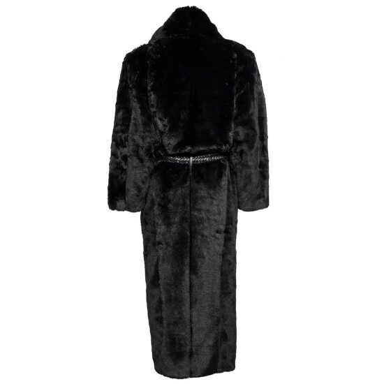 Saint Laurent’s new approach to luxury calls for a faux fur coat that mimics the techniques and sumptuous qualities of real fur. This piece is designed with an elegant shawl collar and has a leather belt that nips the waist.