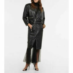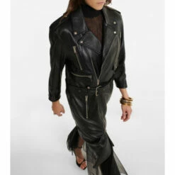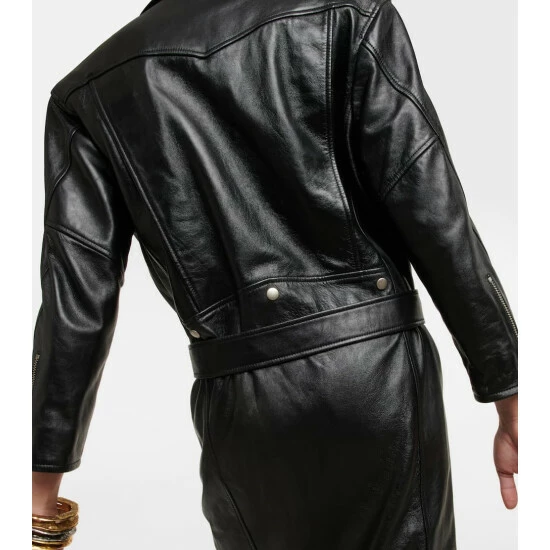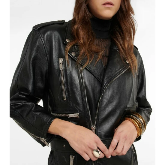 Inspired by the classic biker jacket, this Saint Laurent coat is crafted from drummed leather with silver-toned hardware. Made in Italy, the black style sculpts the figure thanks to the detachable belt cinching the waist and the padded shoulders with buttoned epaulets.