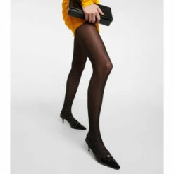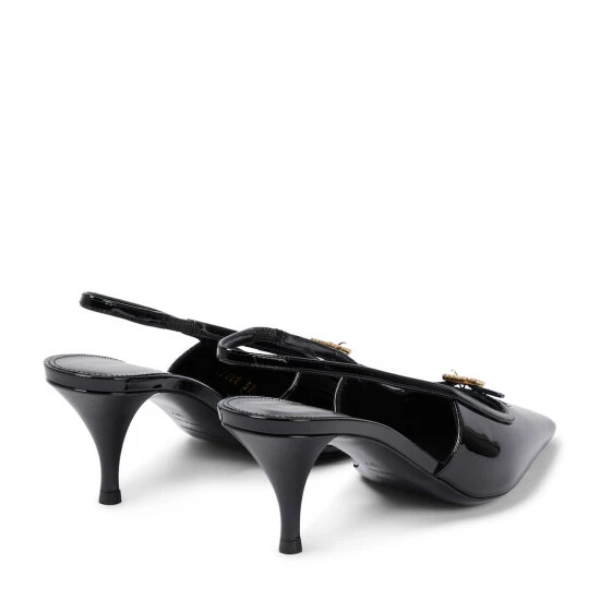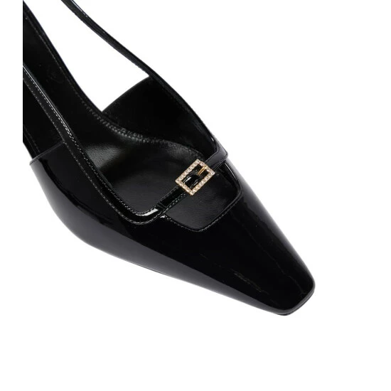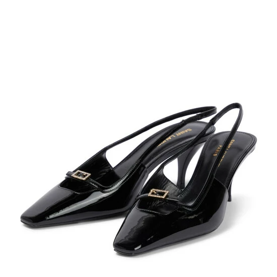 The Blade patent leather slingback pumps show why Saint Laurent is an authority on evening glamor. This black pair comes with an elasticized strap, a square toe, and rhinestone buckle.