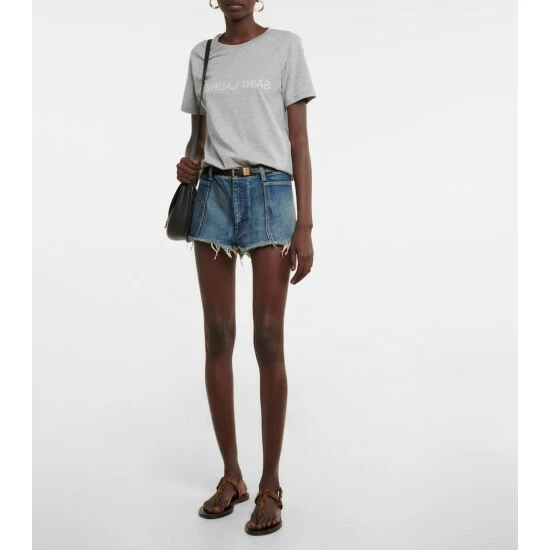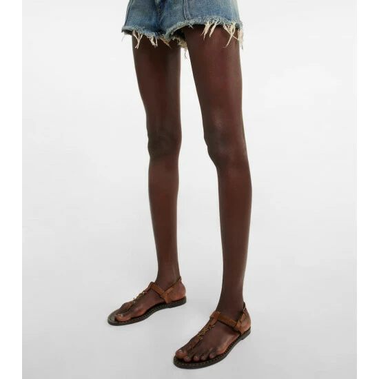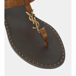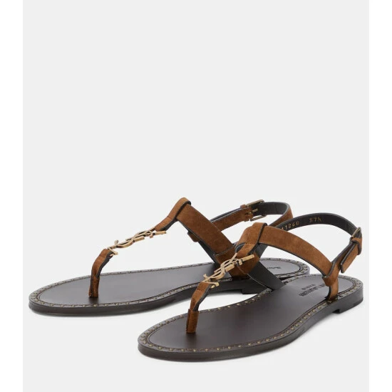 Saint Laurent’s Cassandra line continues to evolve with these flat sandals. They feature suede thong straps, entwined with golden monograms, and secured with buckled straps.
