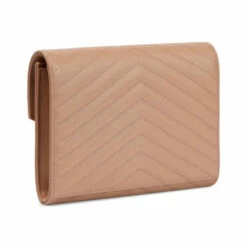Saint Laurent’s iconic Cassandre clutch has a sleek silhouette made from smooth leather with a quilted chevron finish. The label’s signature YSL detail adorns the design in a glossy golden tone.
