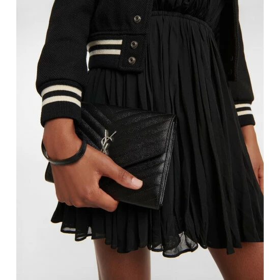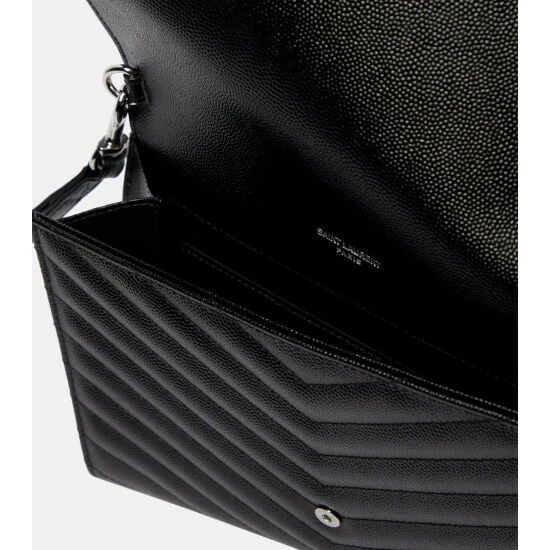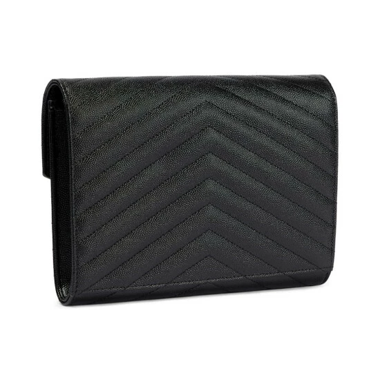 Saint Laurent updates its iconic Cassandre leather clutch in timeless black. The sleek silhouette has been made from grained leather with a quilted chevron finish. The label’s signature YSL detail adorns the design in a glossy golden tone that promises to bring a glamorous finish to your look, day or night.