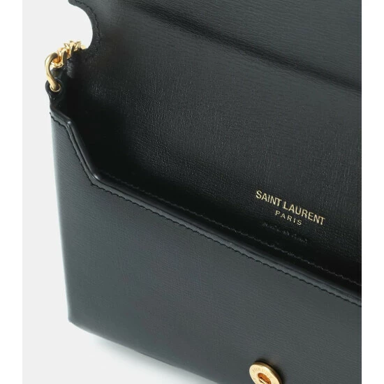 Designed to safeguard your smartphone, coordinate everyday accessories with the Cassandre bag from Saint Laurent. The black design is made from smooth leather with a pale golden YSL plaque, as well as a chain and leather shoulder strap.