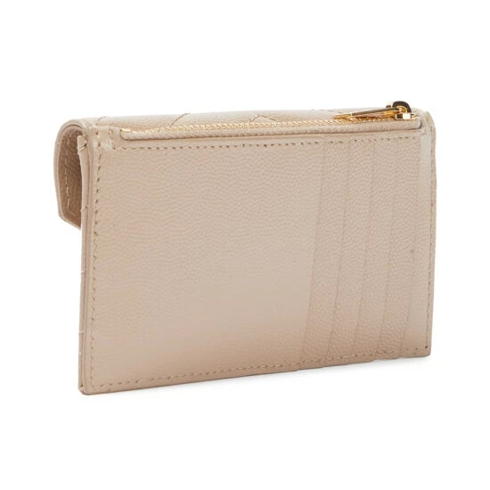 Saint Laurentβs Cassandre wallet is Italian-crafted from leather with a matelassΓ© quilted finish and gold-toned monogram hardware. It opens to a snap-buttoned coin pocket with a zipped pouch and five card slots at the back.