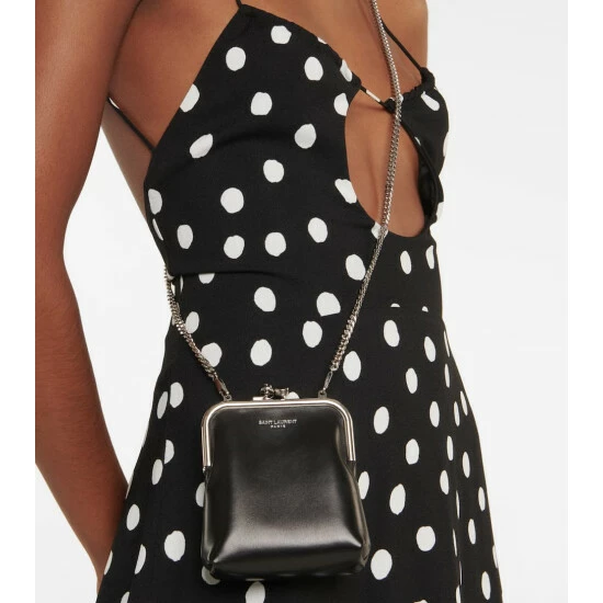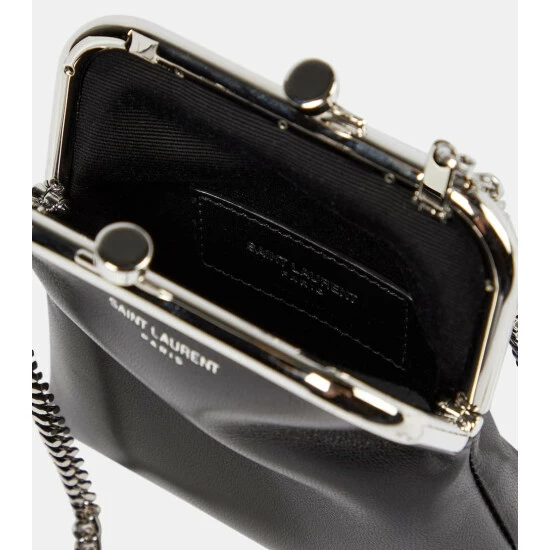 Saint Laurentโs Charniere Mini pouch speaks to Hollywood glamour with a silver-toned chain strap and push-stud clasp. Cut from smooth leather with irresistible logo-detailing, itโs an elegant option from dusk to dawn.