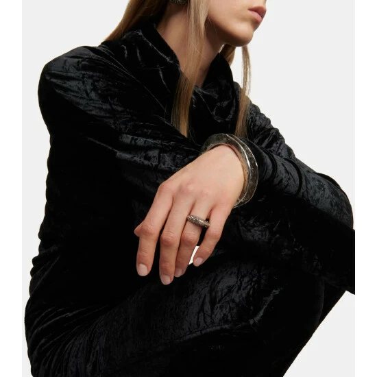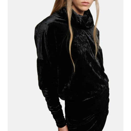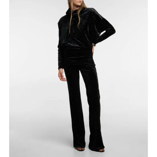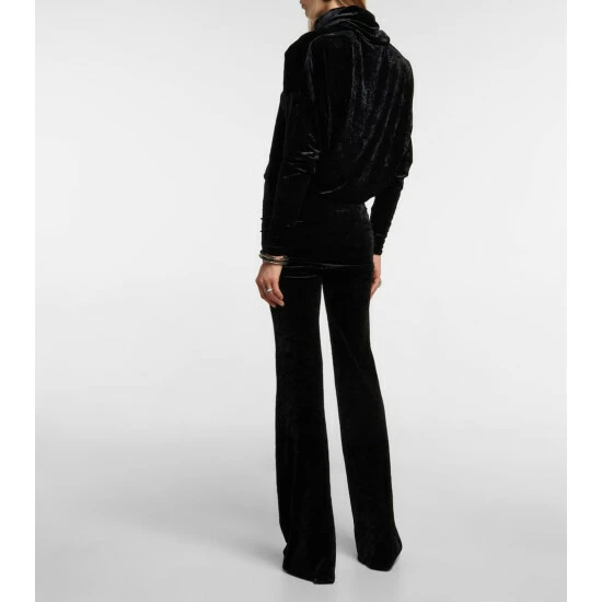 This Saint Laurent top is made from crushed velvet with a high cowl neck and a stretchy silk-blend lining. It has shoulder pads and a fitted, elongated hem that create a triangular silhouette.