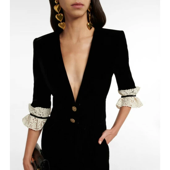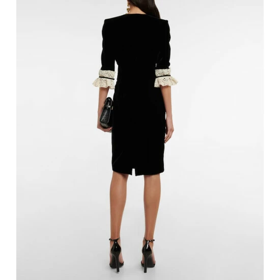 This charming midi dress from Saint Laurent is made from cupro velvet. It has a plunging neckline and is accented with embossed golden buttons and delicate lace trims.