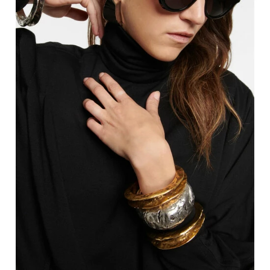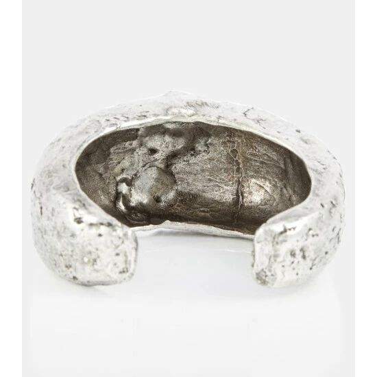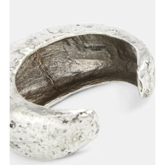 This distressed cuff bracelet from Saint Laurent will add an element of edge to your outfit. With sculpted ridges and holes, this slip-on open cuff has a heavily distressed texture.