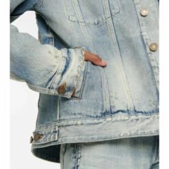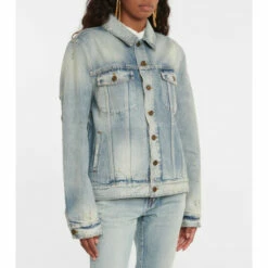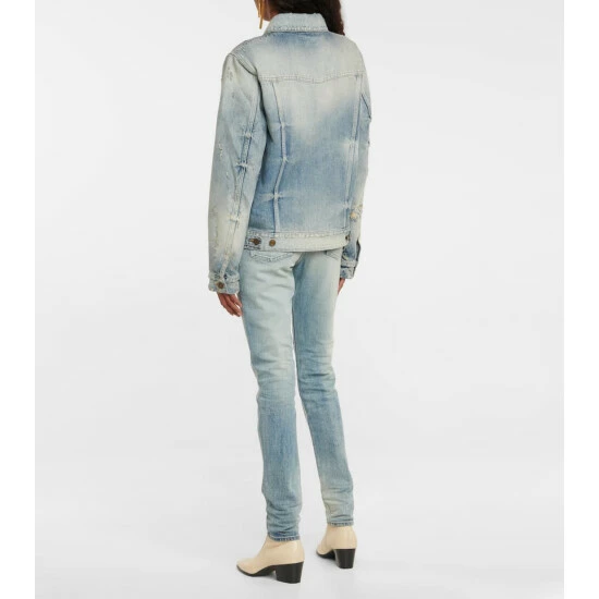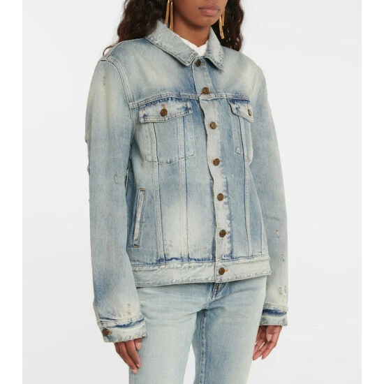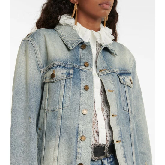 This Saint Laurent jacket is a boxy design in rigid cotton denim. It has distressed detailing and fading throughout.