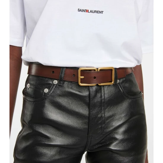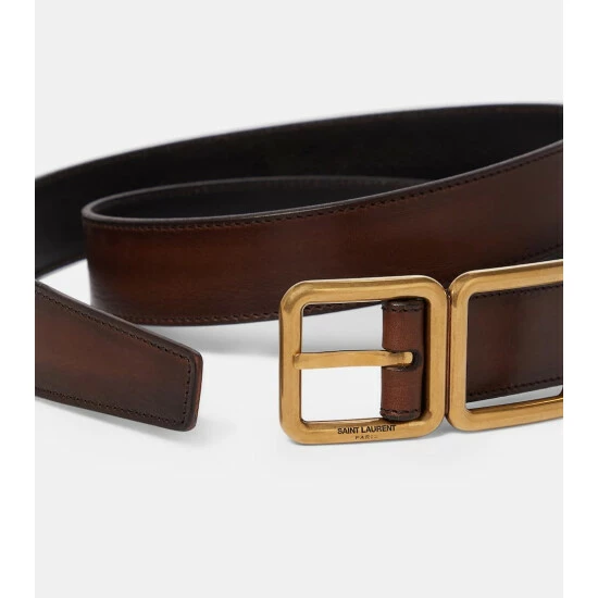 Top off everyday looks with the timeless appeal of this brown belt from Saint Laurent. Made in Italy from leather, it has a distinctive logo engraved double buckle fastening in antique-effect gold-tone hardware.