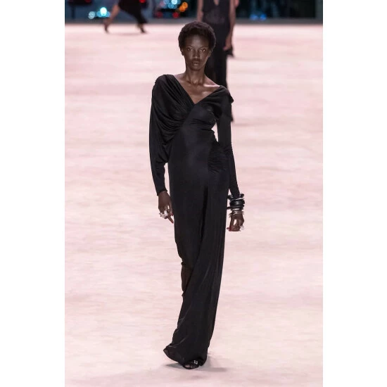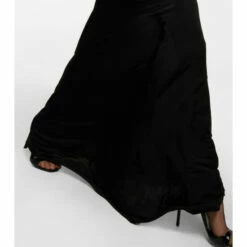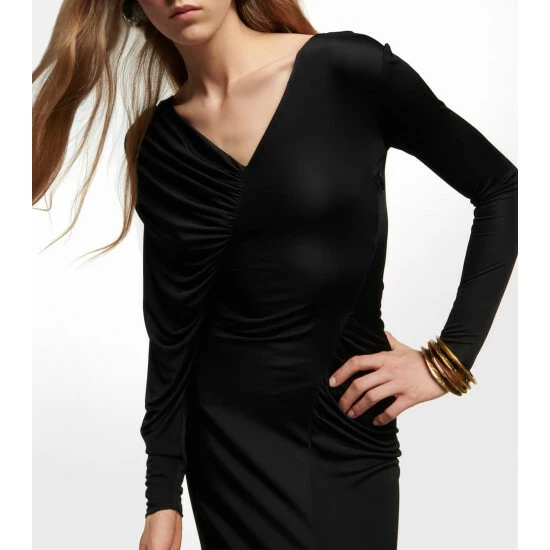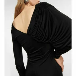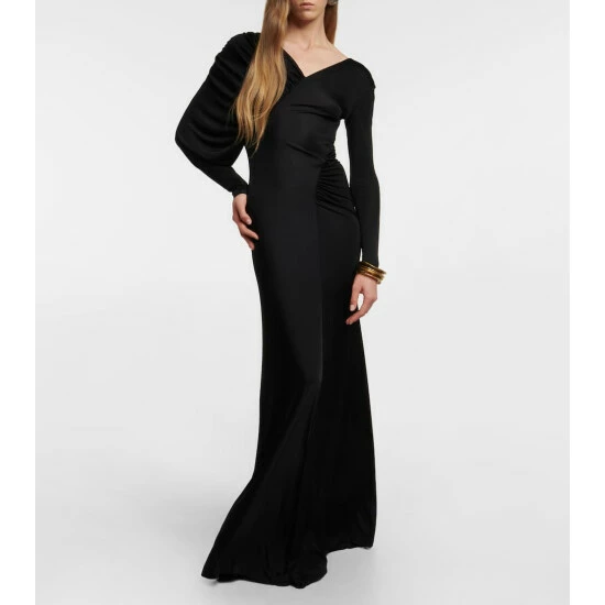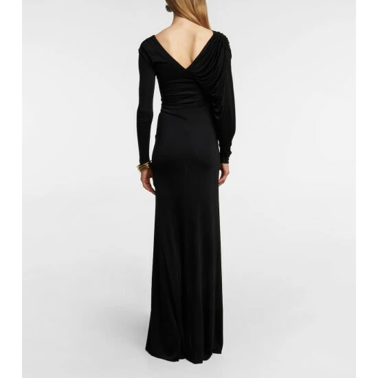 This long-sleeved dress from Saint Laurent is made from jersey in a full-length silhouette with long sleeves and concealed side zip closure. It features an asymmetrical draped design with a batwing sleeve on one shoulder.