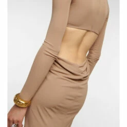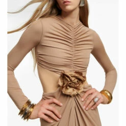 This maxi dress from Saint Laurent is made from soft pliable jersey in a ruched full-length silhouette with eye-catching cutouts at the waist. The elegant style is accented by a tonal corsage detail in front and framed by slim-fitting sleeves.