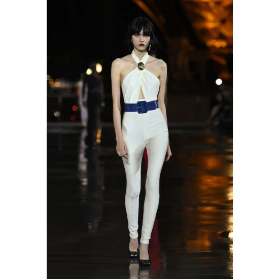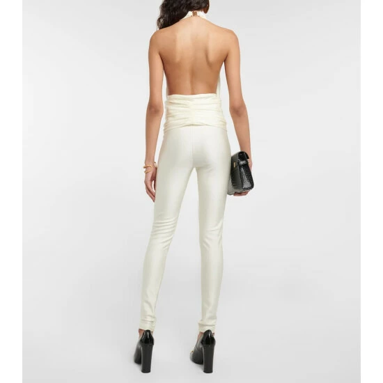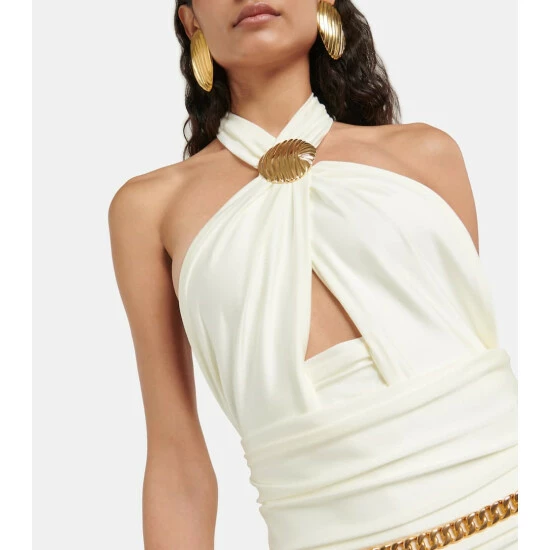 This halterneck jumpsuit from Saint Laurent is made from supple jersey that creates a softly draped effect. It features a cutout center detail and a carved gold-tone hardware embellishment.