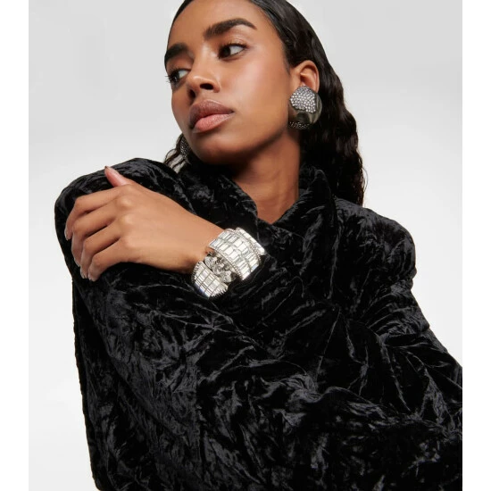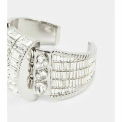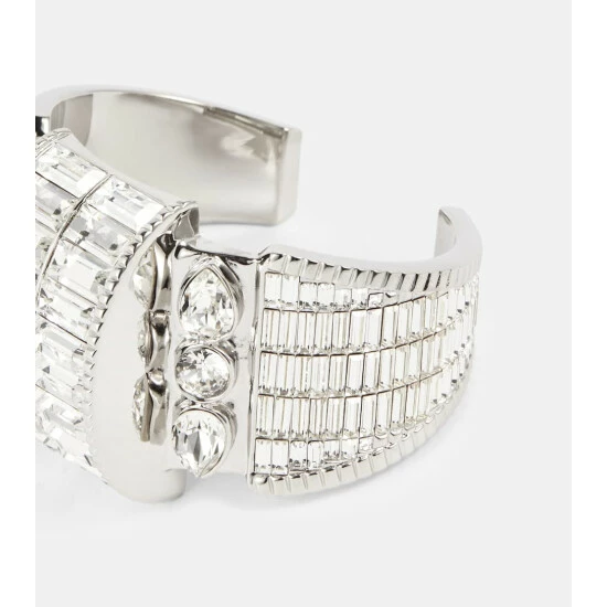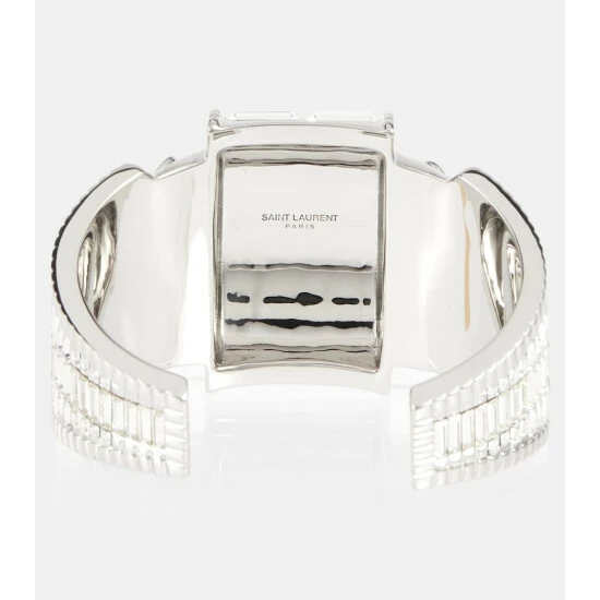 Amp up the glam on any look by slipping on the Empire open-cuff bracelet from Saint Laurent. Made from silver-tone brass, the style features rows of dazzling crystals in different shapes and a logo engraving on the back.