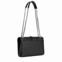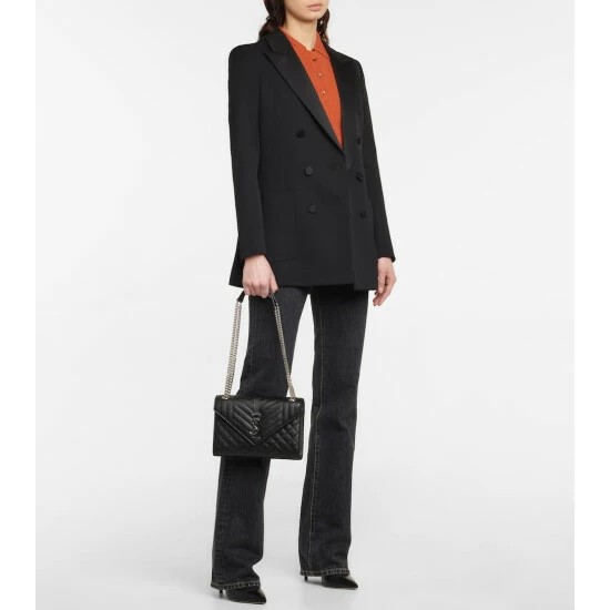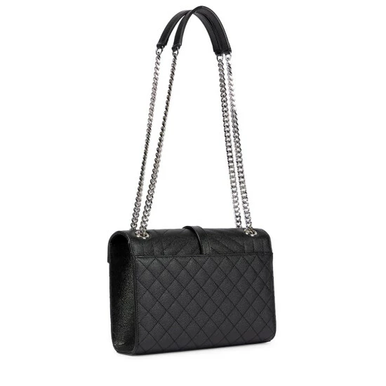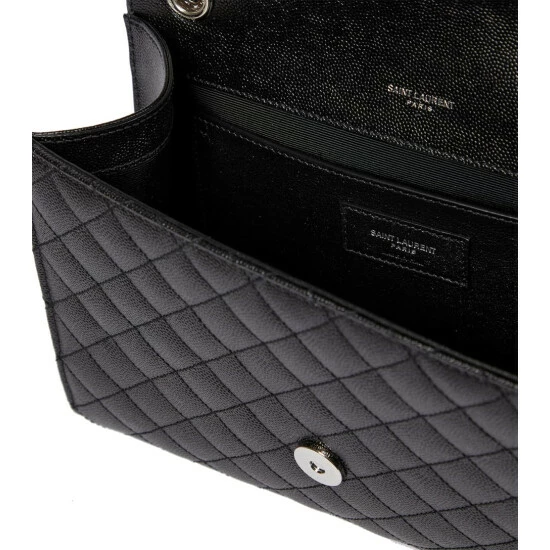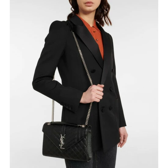 Saint Laurent’s Envelope Medium shoulder bag leads the way for elegant accessories. It’s crafted from black grained leather that’s chevron- and diamond-quilted at places, and carries a signature interlocking YSL emblem at the front.