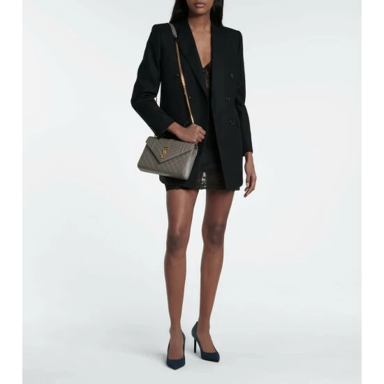 Saint Laurent’s Envelope Medium leather shoulder bag leads the way for elegant accessories of substance. Made from quilted gray leather, the wallet-on-chain style is compact yet practical – the flap top opens to reveal an interior with card slots and a zip compartment. Metallic hardware, including the signature interlocking YSL emblem, adds a touch of luster to the look.