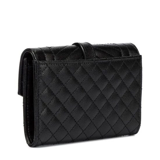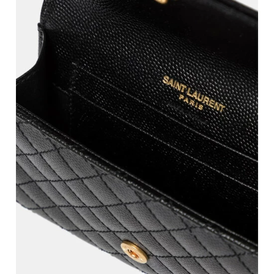 Approach your everyday in style while holding this black Envelope wallet from Saint Laurent. Made from leather with matelassé stitching, it’s emblazoned with signature YSL lettering in golden metal for instant recognition. Slip this compact piece into one of the label’s coordinating bags.