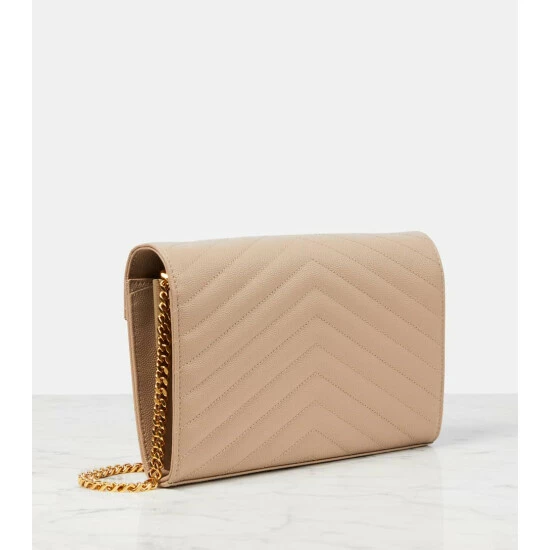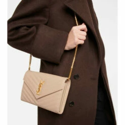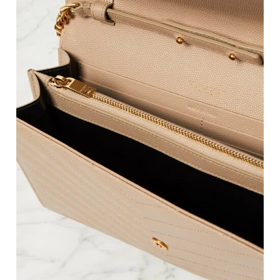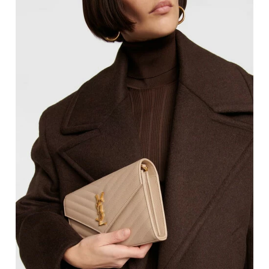 Saint Laurent’s Envelope Small wallet on chain is made from quilted beige leather and topped with unmissable monogram hardware. Hold it in your hand or carry it on your shoulder with the golden chain strap.
