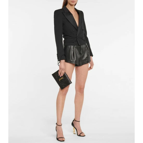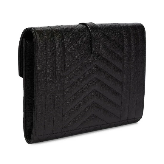 Approach your everyday in style while holding this black Envelope wallet from Saint Laurent. Made from leather with matelassé stitching, it’s emblazoned with signature YSL lettering in golden metal for instant recognition. Secures its wristlet fastening around your arm to ensure easy portability.