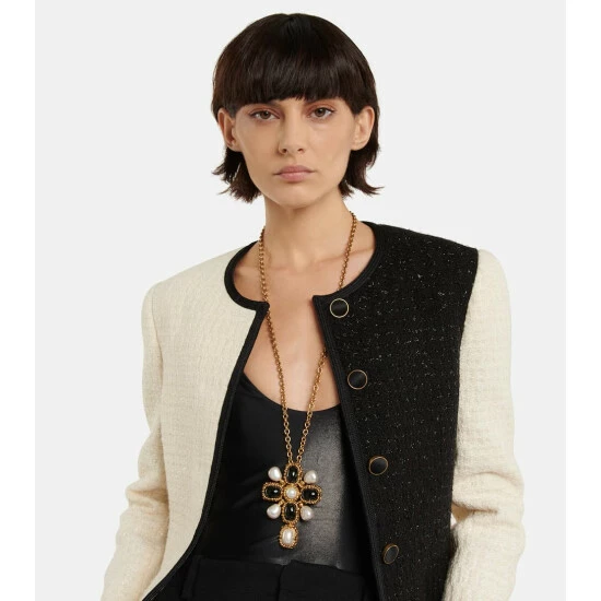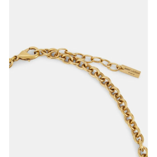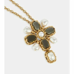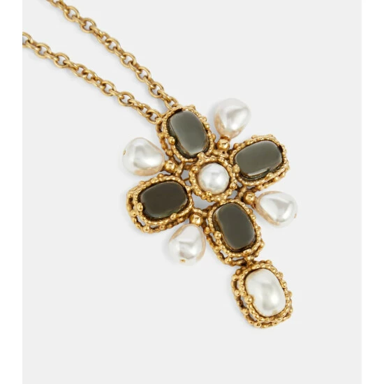 Look to this necklace from Saint Laurent for an eye-catching imprint on your ensembles. Its antique gold-toned cable chain is punctuated by a baroque-inspired cross pendant thatโs embellished with stones and pearls.