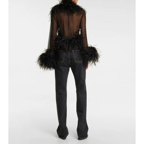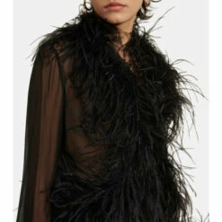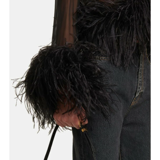 Saint Laurent brings us a blouse best suited for dramatic evening looks with ostrich feather trim on the collar, cuffs, and hem. Made from sheer silk mousseline, it’s cut with a V-neck and front button closure.