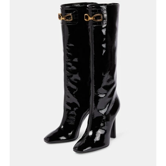 Adopt Saint Laurent’s signature glamour by slipping into the Jane boots. Made in Italy from patent leather to a knee-high silhouette, they have square toes and are accented with gleaming horsebit hardware at the front.