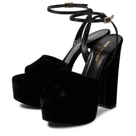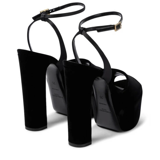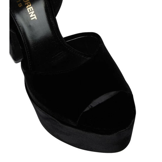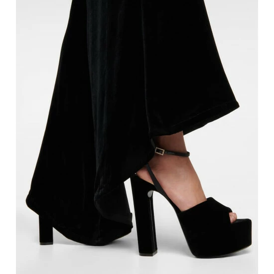 Elevate your evening footwear with these glamorous platform sandals from Saint Laurent. Made in Italy from black velvet, the style features thin adjustable ankle straps and towering block heels.