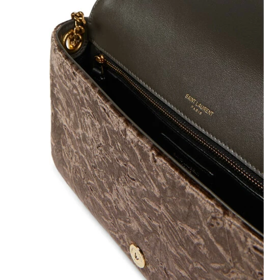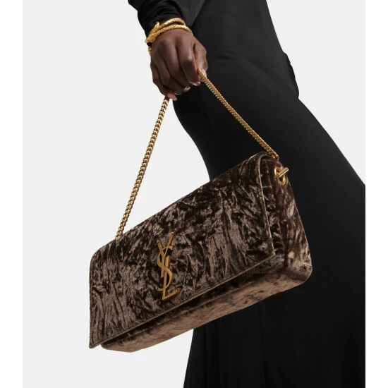 The Kate 99 shoulder bag from Saint Laurent is made from velvet and lined with leather. It features a front flap with the YSL logo in front, snap-buttoned fastening, and an antiqued gold-tone detachable chain strap.