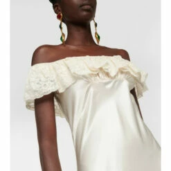 Straight off the runway, this ready-to-wear satin gown exudes timeless elegance. Its floor-sweeping silhouette is accented with off-shoulder lace trimming and delicate pleating at the bodice.