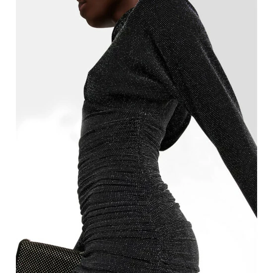 Featuring slight ruching on the hips, this Saint Laurent minidress features a curve-hugging skirt and a relaxed bodice. The lamΓ© design is finished with a high neckline and shoulder pads.