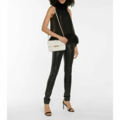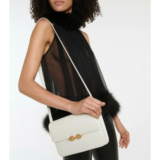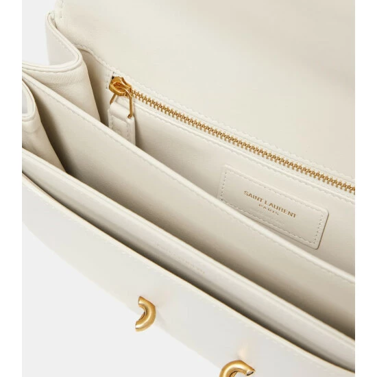 The Maillon design is the ultimate Saint Laurent bag. Taking its name from the golden chain that adorns the foldover flap, this practical piece β which has been made from smooth white leather β will “link” all of your outfits together. It has been designed in an accordion shape, with a front slot and two divided compartments, one of which contains a zipped pocket.