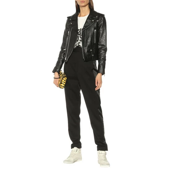 Infuse your edit with a sense of rebelliousness courtesy of Saint Laurent’s classic biker jacket. This timeless black style has been crafted in Italy from calf leather and comes complete with silver-toned metal zips and stud details. Numerous pockets heighten the motorcycle feel of the piece, while a slightly cropped fit indulges the feminine side. Style yours with distressed denim and minidresses alike to channel the Parisian label’s effortless cool.
