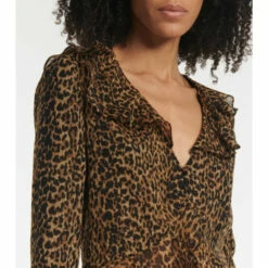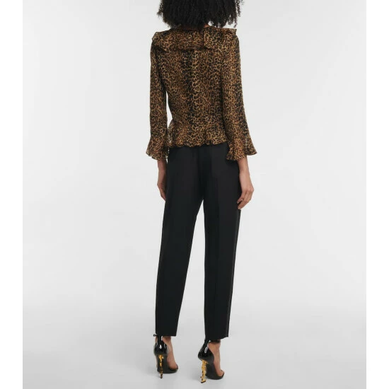 Add feline flair to your edit with this leopard print blouse from Saint Laurent. The cropped style is made from wool and features charming ruffled trims with two fabric-covered buttons connecting the center.