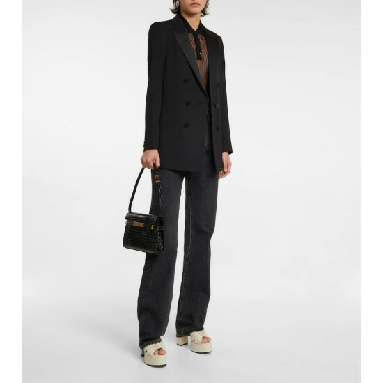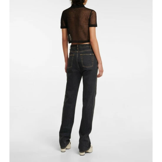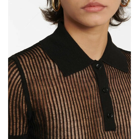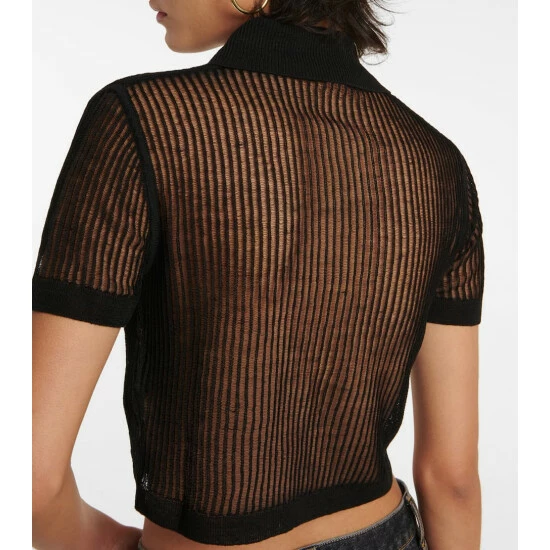 This semi-sheer polo shirt from Saint Laurent has a cropped fit and mesh-like appearance. It’s knitted with stockinette and ladder stitching techniques from linen and silk yarn.