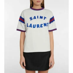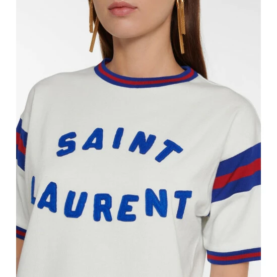 Saint Laurent gives the classic T-shirt a retro touch. Made from cotton-blend jersey, this piece is patched with bold logo lettering and finished with striped panels at the sleeves.
