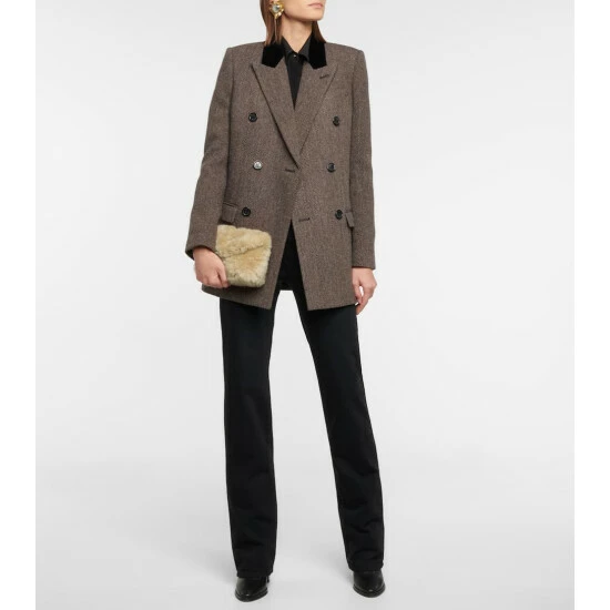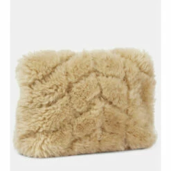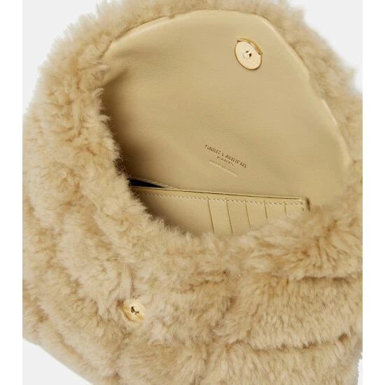 The puffer jacket, a favorite silhouette among the fashion set, informs the design of this beige Loulou Puffer clutch from Saint Laurent. Padded and quilted with a chevron effect, it’s made from soft, curly shearling with a flap top and internal slots. Its small size makes it easy to clutch in hand or clamp under your arm as a trendy pouch.