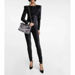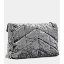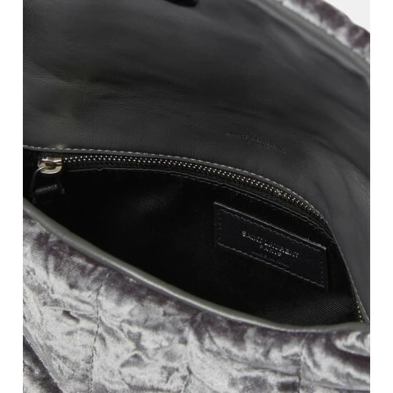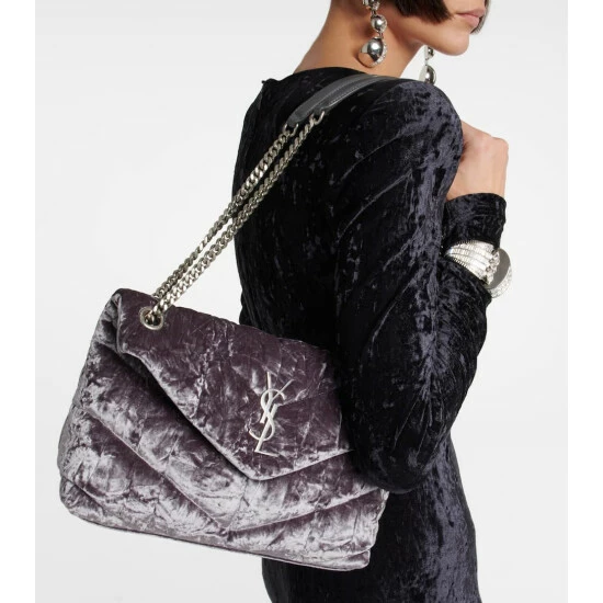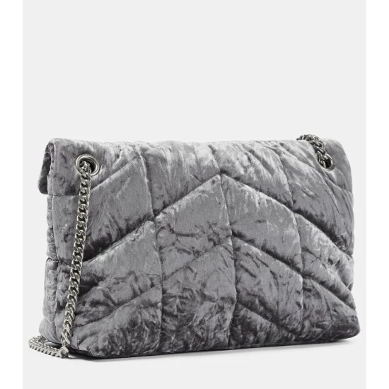 Saint Laurent lends a wintry touch to its signature silhouette, the Loulou Puffer bag, crafting this pillowy design from plush velvet. Made in Italy, the quilted gray style is finished with silver-toned hardware, including a chain strap and the iconic YSL monogram on the front flap.
