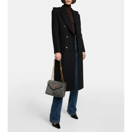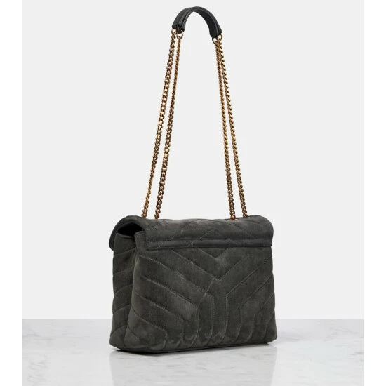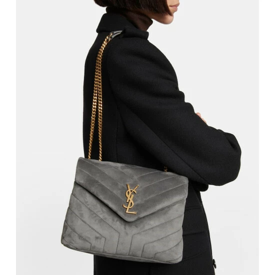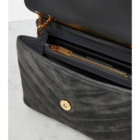 The Loulou bag is a Saint Laurent signature, appearing with the instantly-recognizable YSL plaque. This quilted suede style appears in an envelope style with sliding chain shoulder straps that can be adjusted for crossbody styling.