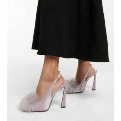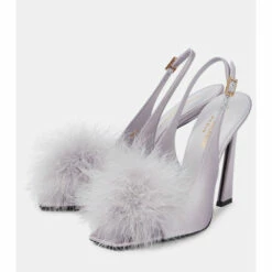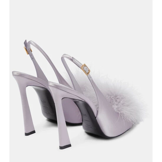 Finish elegant ensembles with Saint Laurentβs Mae slingback sandals set atop flared heels. Made from lustrous crΓͺpe satin, the pair feature squared peep toes and crystal-embellished buckles and are defined by their fluffy feather fronts.