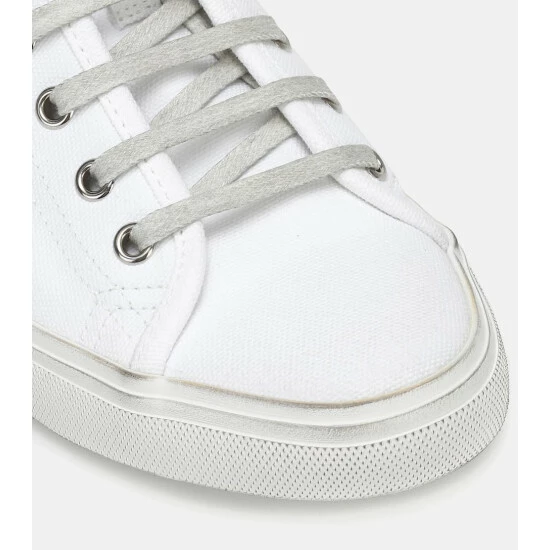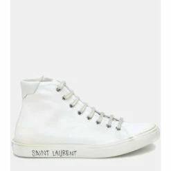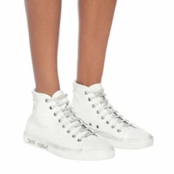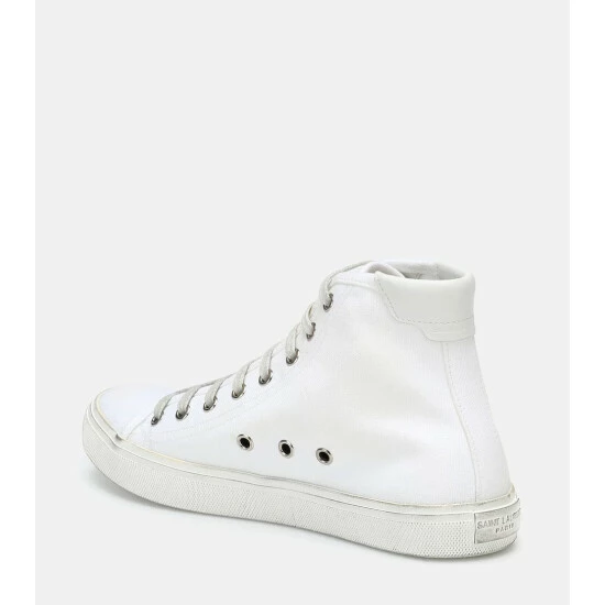 Emulate Saint Laurentโs signature sense of nonchalance with these white Malibu sneakers. Made in Italy from canvas with leather heel tabs, theyโre set on rubber soles inscribed with the house logo in a DIY effect. The high-top silhouette is calling to be worn with cropped denim.