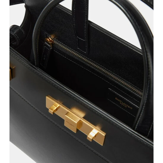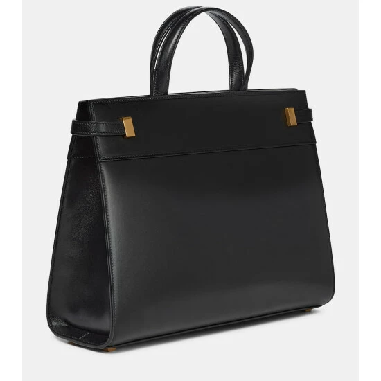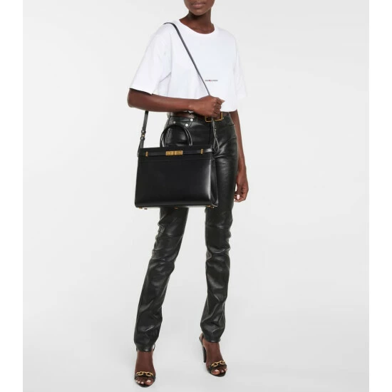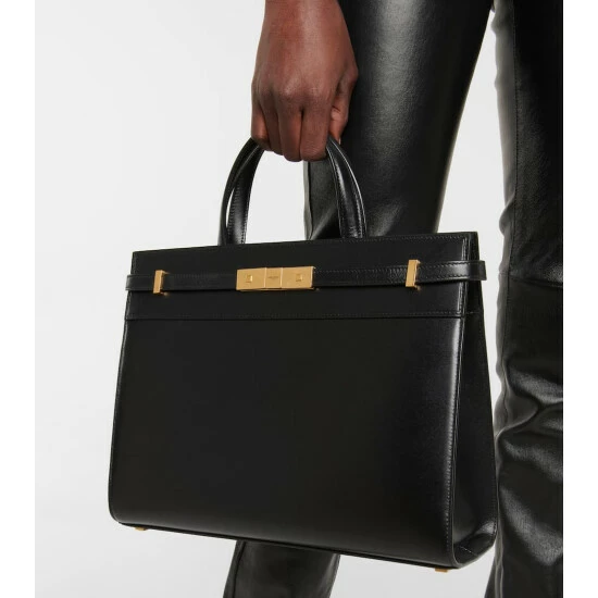 Saint Laurent manifests structured elegance with the Manhattan Small tote. Crafted in Italy from black leather, this bag features a golden-tone logo plaque fastening that offers subtle branding. Depending on your mood, carry it by the top-handles or go hands-free with the detachable leather straps.