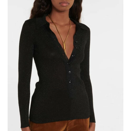This top from Saint Laurent is made from semi-sheer mesh that’s interwoven with metallic flecks for a light glimmer. It has a polo collar, a partial-button placket and a slim fit that makes it ideal for layering.