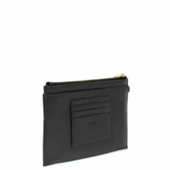 Organize your essentials in style with this black pouch from Saint Laurent. Made in Italy from matelassรฉ calf leather, this slim piece is decorated with the house’s golden monogram logo, and is complete with a zipped top and card slots at the back. Wear yours on your wrist, using the detachable strap for secure carry.
