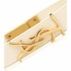Add instant recognition to everyday ensembles with this cream bracelet from Saint Laurent. Made in Italy from grained leather, this style boasts a slim silhouette that’s decorated with the house’s iconic YSL initials in gleaming golden hardware. Wear yours alone, or stacked with other pieces from the label.