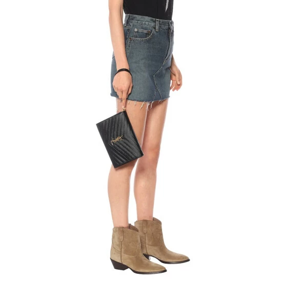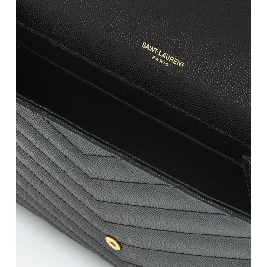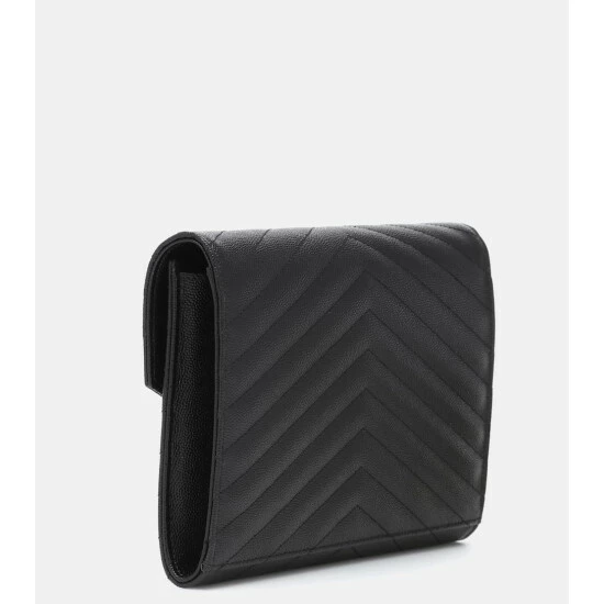 This black Monogram clutch from Saint Laurent is a timeless accompaniment to your evening wardrobe. Made in Italy from textured leather featuring the houseโs signature chevron quilting, it has a detachable loop strap, and is accented with the iconic YSL logo in gold-tone metal on the front.