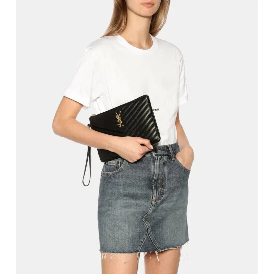 This classic design by Saint Laurent can never go out of fashion. Crafted from matelassé leather and decorated with the recognizable monogram, the pouch will give your evening look a touch of timeless elegance. Wear yours on your wrist using the detachable wrist strap.