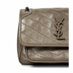 Seasoned Saint Laurent fans will immediately recognize the tonal YSL emblem on the Niki Baby shoulder bag. It’s made from calf leather that’s been treated to look crinkled for a vintage effect.