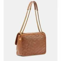 Saint Laurent’s iconic Niki Medium shoulder bag is reinterpreted in brown chevron-quilted leather. This capacious design features YSL hardware and comes with a chain and leather strap that can be worn in multiple ways.